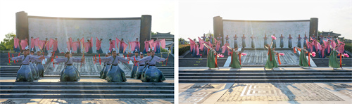 “泗水王劉靖”“婕妃”以諸侯之禮歡迎賓客,儀仗肅立、華蓋蔽日,再現(xiàn)興盛時(shí)期“大漢酒國(guó)”的榮耀與威儀。基地員工依諸侯禮節(jié)表演了六佾文舞,彩帶紛飛、古韻十足,展現(xiàn)了“仁義禮智信”的中華正統(tǒng)文化精髓。