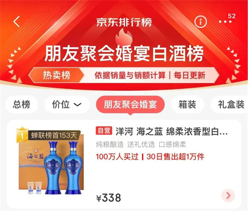 在天貓熱銷排行榜上,海之藍也是名副其實的“榮譽王”。海之藍42度禮盒和海之藍52度禮盒登上天貓白酒禮盒回購榜TOP1與TOP2。