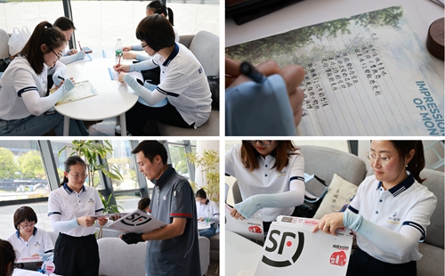 初夏的酒都公園涼風習習,酒史館前的大草坪,布置精美雅致,粉紅氣球與鮮花交相輝映,將儀式感拉滿,歡迎酒嫂的到來?!拔覑垩蠛印薄拔沂茄蠛泳粕?,我自豪”“愛上洋河,愛在洋河”“小家美滿,洋河大家越來越好”……酒嫂拍照留念記錄下最美好的時刻,并寫下對愛人、對家庭、對洋河最真摯的祝愿。